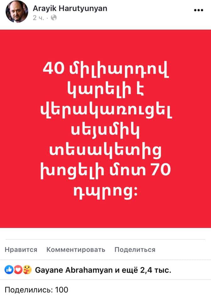 Մեկ տարվա մեջ, պարգևատրումների տեսքով 50 մլն դոլարից ավել փող մսխած իշխանության նախարարն ա գրել: Փաստորեն լավ էլ գիտեն, թե որտեղ փողի կարիք կա, բայց առաջնահերթությունը տալիս են պարգևատրմանը: Սրանք իրենց ընտրողներին ու դեռ հավատացողներին լրիվ անասունի տեղ են դրել։