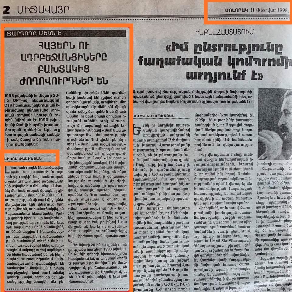 Փաստորեն, ՀՀ ղեկավարի աթոռին է նստել մի մարդ, ով մեկ րոպե լռությամբ հարգում է (համենայն դեպս, «Մոլորակ» թերթի 1998թ. փետրվարի 11-ի համարում հարգել է) խորհրդային տանկերի շղթաների տակ մնացած ադրբեջանցիների հիշատակը: Այն ադրբեջանցիների, որոնք տանկերի տակ ընկան նաև տեղի հայերին ցեղասպանության ենթարկելու պատճառով` զանգվածային սպանդ, խոշտանգում, կանանց հանդեպ դաժան ոտնձգություններ, թալան ևն: