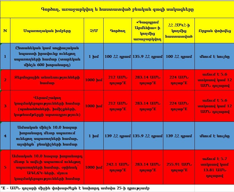 Անդրադառնալով սպառողների համար սահմանված գազի սակագներին, հիշեցնենք, որ ՀՀ ՀԾԿՀ-ն որոշեց՝ 2020թ. հուլիսի 19-ից ՀՀ բնական գազի բոլոր սպառողների համար, բացառությամբ էլեկտրական էներգիա արտադրող ջերմային էլեկտրակայանների, որոնց համար՝ 2020թ. օգոստոսի 1-ից, հաստատել հետևյալ սակագները (Տե՛ս աղյուսակը)՝