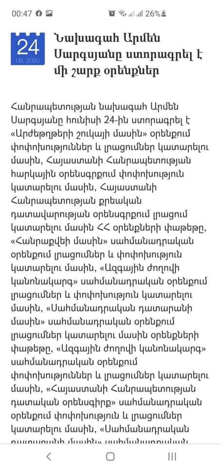«Նախագահ Արմեն Սարգսյանը «ինքնամոռաց աշխատում է»։ Գիշերվա կեսին ստորագրել է Սահմանադրական փոփոխությունները ստորագրելու (կամ ՍԴ ուղարկելու) լիազորությունից նախագահին (այսինքն՝ ինքն իրեն) զրկելու մասին օրինագծերը, որպեսզի առավոտյան «Պաշտոնական տեղեկագրում» հրապարակեն ու ուժի մեջ մտցնեն։