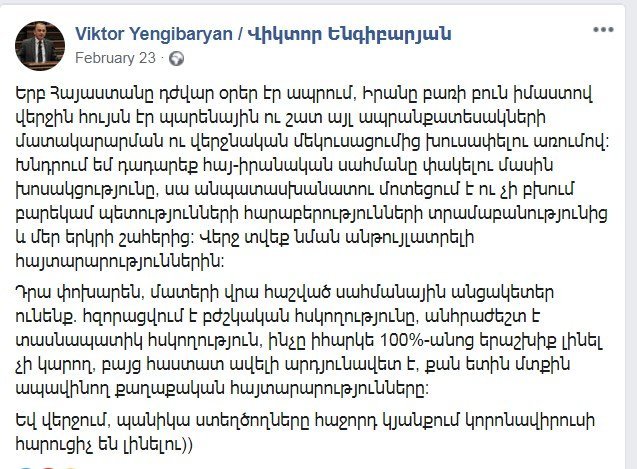 Սաղ հերթով իրանց փայ բորշն ուտում են: Էս անհայտ պատգամավորն էլ ասում էր՝ «Իրանի սահմանը պետք չի փակել: Հզորացվում է բժշկական հսկողությունը, անհրաժեշտ է տասնապատիկ հսկողություն, ինչը, իհարկե, 100%-անոց երաշխիք լինել չի կարող, բայց հաստատ ավելի արդյունավետ է, քան ետին մտքին ապավինող քաղաքական հայտարարությունները: Եվ վերջում պանիկա ստեղծողները հաջորդ կյանքում կորոնավիրուսի հարուցիչ են լինելու»։