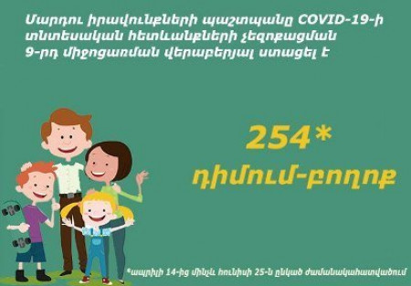 Մարդու իրավունքների պաշտպանը Հայաստանում նոր տեսակի կորոնավիրուսի (COVID-19) տնտեսական հետևանքների չեզոքացման 9-րդ միջոցառման վերաբերյալ ստացել է 254 դիմում-բողոք, որից 116 թեժ գծին ահազանգերի թիվը կազմել է 93։