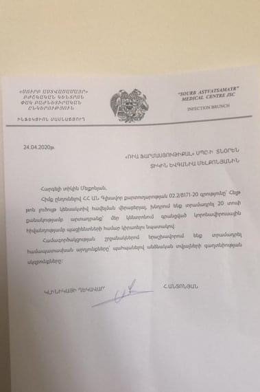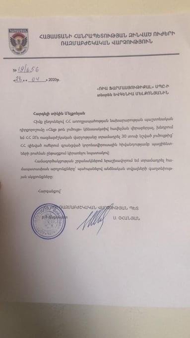 Նման նամակ է ուղղել RHEA Pharmaceutical ընկերությանը նաև ՀՀ ՊՆ ռազմաբժշկական վարչությունը (տե՛ս նկ. 3):