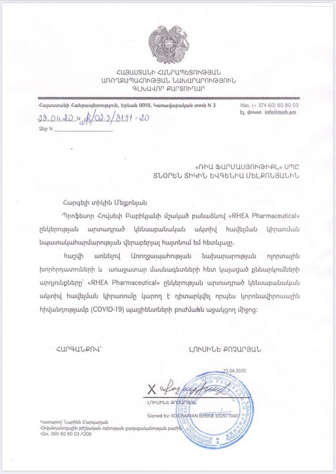 Համաձայն առողջապահության նախարարության սույն թվականի մարտի 23-ի թիվ 02-2/8171-20 գրության՝ RHEA Pharmaceutical ընկերության կողմից արտադրված կենսաակտիվ հավելումը կարող է դիտարկվել, որպես կորոնավիրուսային հիվանդությամբ բուժառուների բուժմանն աջակցող դեղամիջոց: Գրության մեջ նշվում է, որ այս եզրակացությունը հիմնված է ոլորտային խորհրդատուների և ոլորտի առաջատար մասնագետների հետ ունեցած քննարկումների արդյունքների վրա (տե՛ս նկ. 1): Այս գրությունը ուսումնասիրելիս, պարզ է դառնում, որ առողջապահության նախարարությունը փորձել է #HealthTone (Հելթ Տոն) արտադրատեսակի կիրառման պատասխանատվությունը իր վրայից գցել՝ հղում անելով «խորհրդատուների» և «ոլորտի առաջատար մասնագետների» կարծիքների վրա և նույն ժամանակ նշում է, որ #HealthTone (Հելթ Տոն) արտադրատեսակը ոչ է ցուցված է բուժման համար, այլ «կարող է դիտարկվել», որպես «բուժմանը աջակցող միջոց»: