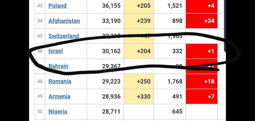 Իսկ հիմա ամենակարևորի մասին...Ինչ վերաբերում է Նիկոլի մատնանշած "Իսրայելում այսօր ունեն օրական հազարից ավելի դեպք"-ին, ապա նշեմ, որ կոնկրետ այսօր հրեական պետությունում գրանցվել է վարակման 204 և մահվան 1 դեպք (տե՛ս լուսանկարը https://www.worldometers.info/coronavirus/ կայքից)...