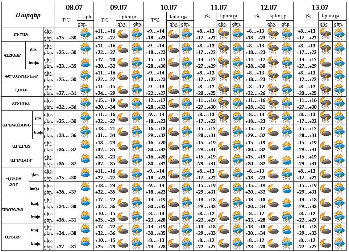 Հանրապետության տարածքում՝ հուլիսի 8-ի ցերեկը, 12-ին առանձին շրջաններում, 9-11-ը, 13-ին շրջանների զգալի մասում գիշերը և կեսօրից հետո սպասվում է կարճատև անձրև և ամպրոպ, ամպրոպի ժամանակ` քամու ուժգնացում՝ 25-30մ/վ: Առանձին վայրերում սպասվում է նաև կարկուտ: