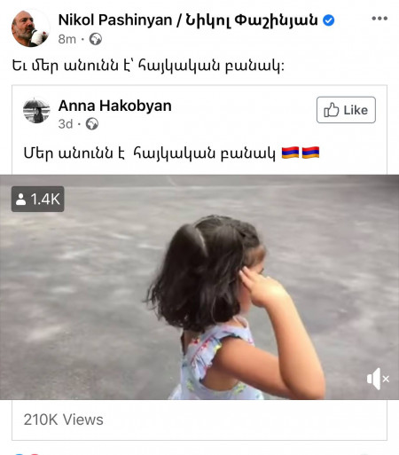 Տիկնայք ու պարոնայք ձերքայլականներ, ձեր գժին հիշացրեք, որ ինքը էս պարագայում «փոքրիկ Արփիի» հայրիկը չի, ինքը պետության ոչ բարով գերագույն գլխավոր հրամանատար ա: Պետության, որի միջազգայնորեն ճանաչված սահմանի վրա հենց հիմա տանկերով կրակում են: Ինքը պիտի հիմա ՀԱՊԿ-ին ու ԵԱՀԿ-ին նամակներ գրեր, զանգեր դաշնակից երկրներին ղեկավարներին, ոչ թե կառավարական դարայի հայաթում վազվզող իր երեխու վիդեոն դներ, երբ հազարավոր ծնողներ աղոթում են սահմանին կանգնած իրանց երեխեքի կյանքի համար:
