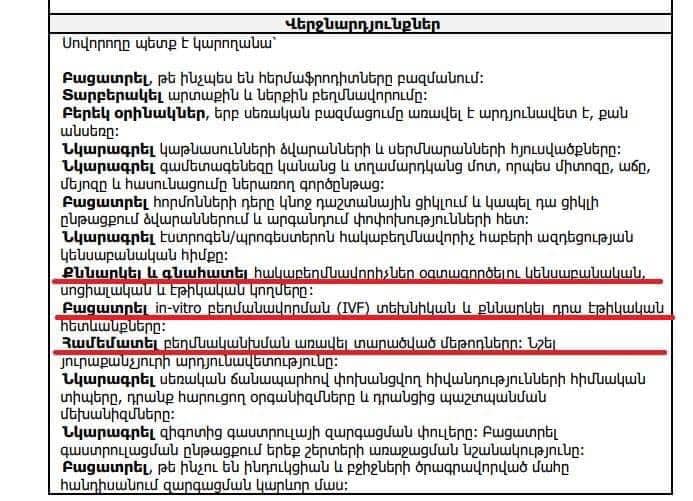 Նոր կրթական ծրագրին համահունչ կենսաբանություն առարկան աշակերտներին սովորեցնելու է սեռական ճանապարհով փոխանցվող հիվանդությունների և հակաբեղմնավորիչների մասին և շեշտադրում է արվում հղիության ընդհատմանը՝ փոխանակ հղիանալու բերկրանքի և առողջ սերնդի վերարտադրությունը լինի գլխավորը։