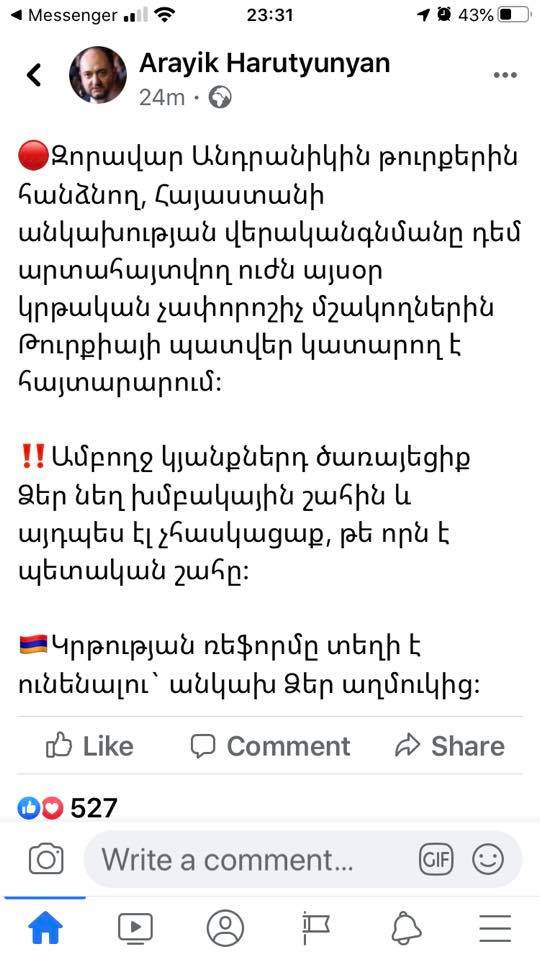 Արայիկ Հարությունյան, ես ամաչում եմ, որ քո հետ նույն կառավարության կազմում եմ եղել: Գիտության նախարար, ով տարրական գիտելիք չունի սեփական երկրի պատմության վերաբերյալ: Քո՞ պես սերունդ ես ուզում կրթել...