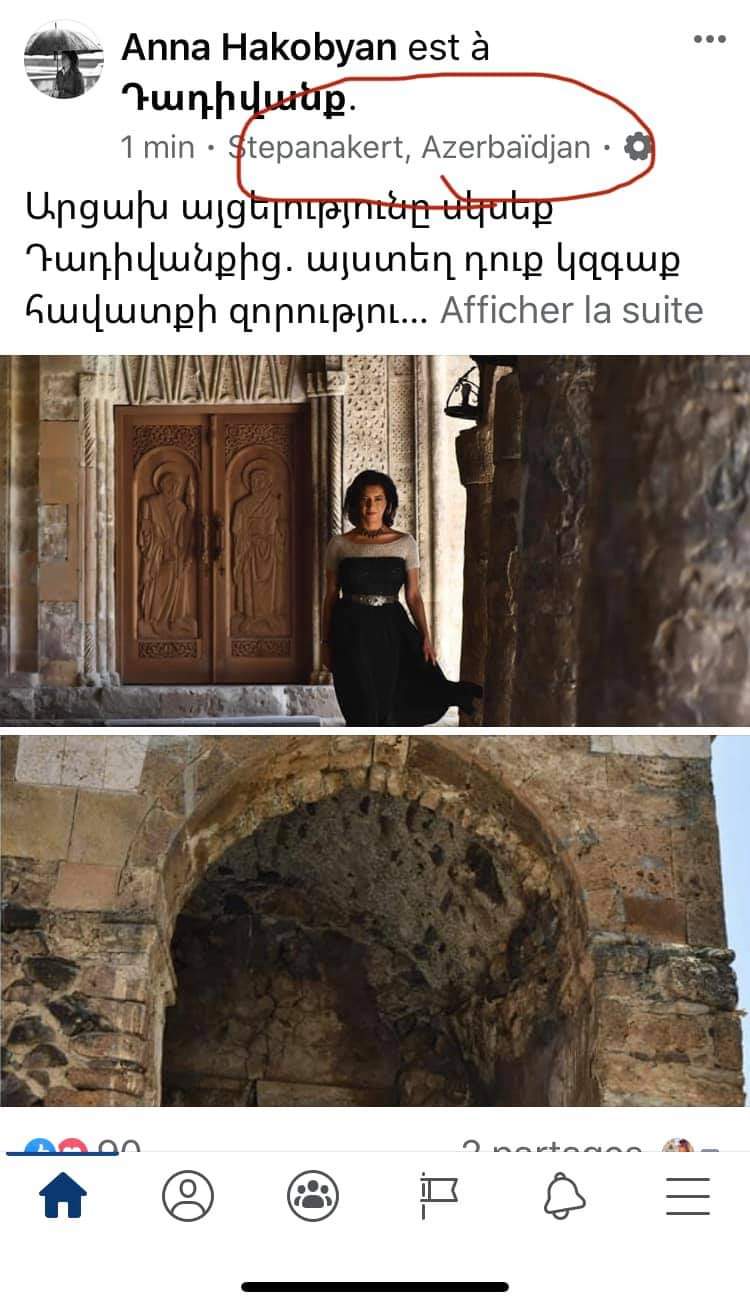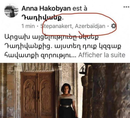 Սա հայտնվելուց մոտ կես ժամ հետո location-ը հանվեց, բայց դե տիկին Հակոբյանը չի գիտակցում, որ ինքը շարքային քաղաքացի չի, որ նման հարցերում անուշադիր լինի ու վրիպի: Հատկապես Արցախի հարցում ամեն քայլն ու բառը հավասարակշռված ու հաշվարկված պիտի լինի: