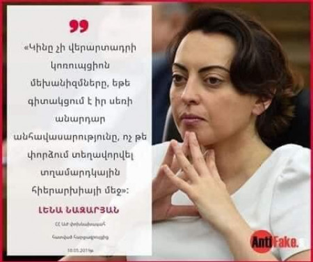 Երբ այն անհասկանալի ծագման քվազի-քաղաքական գործիչը, որին Գյումրիից քայլելուց առաջ ոչ ոգ չէր ճանաչում, կոռուպցիայի լրջագույն խնդիրը տանում է կանանց և տղամարդկանց հավասար իրավունքների և հնարավորությունների հարթակ, ես երիցս համոզվում եմ, որ սրանք ընդհանրապես ժողովրդավարությունից, հավասար իրավունքներից և հատկապես կոռուպցիայից ոչինչ չեն հասկանում: