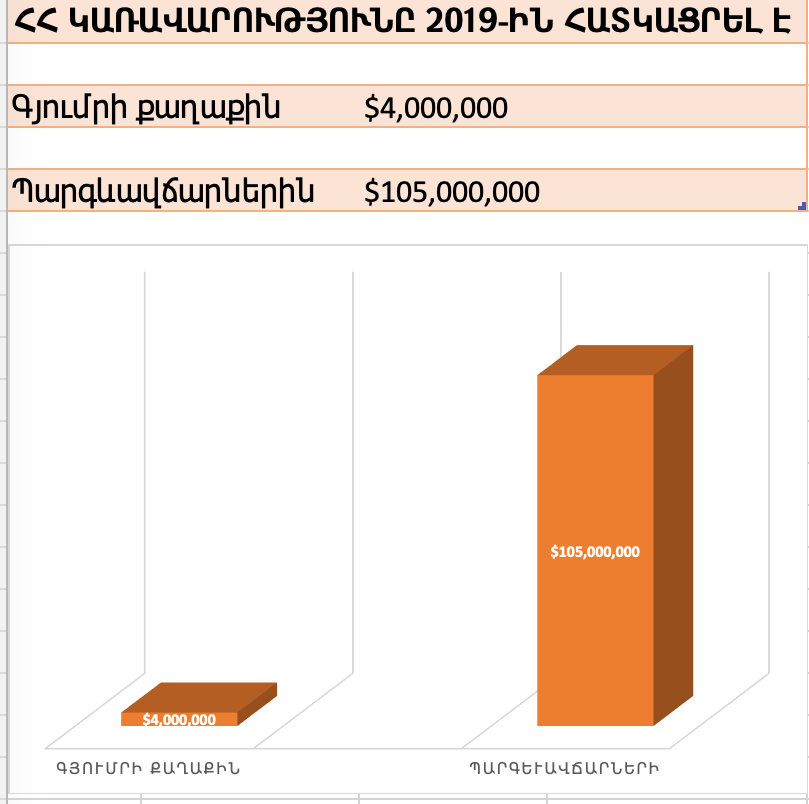 Ստացվում է, որ ՀՀ կառավարությունը յուրաքանչյուր գյումրեցու կյանքն արժանապատիվ դարձնելու համար տարեկան հատկացնում է ընդամենը 57 ԱՄՆ դոլար (70.000 բնակչի հաշվարկով)։