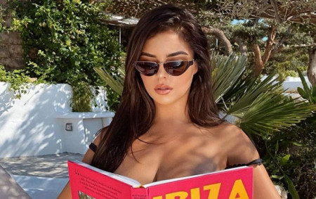25-ամյա բրիտանուհին ձեռքին բռնել է մեծ գիրք, որի վրա գրված է «Ibiza Bohemi»: