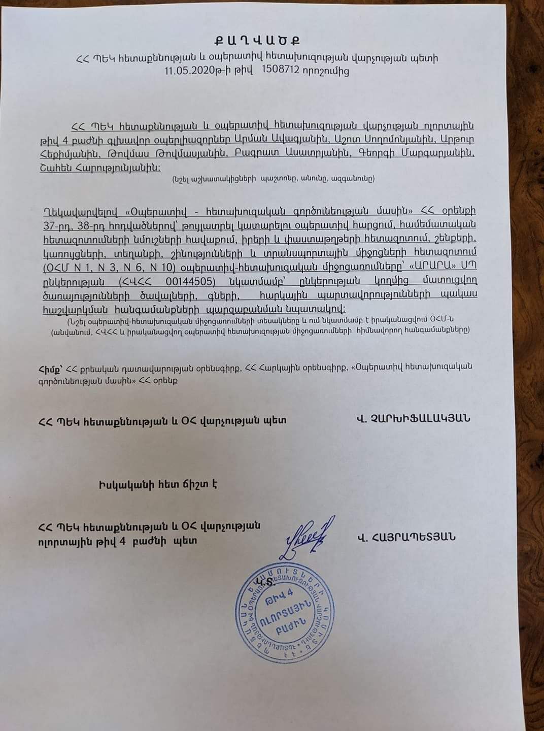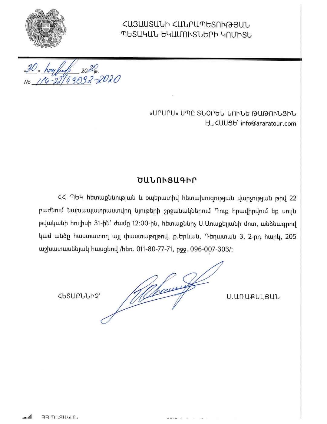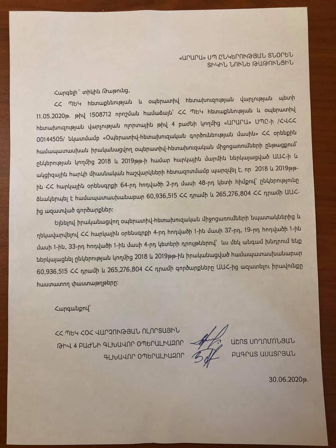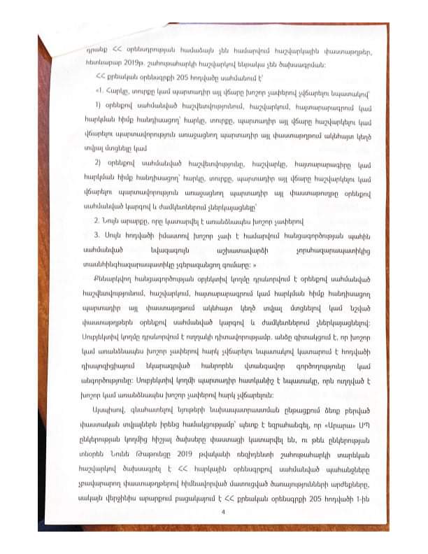 Մոտ չորս ամիս առաջ , իսկ ավելի կոնկրետ մայիսի 11-ին մեր կաթվածահար եղած երկրում , իմ կաթվածահար եղած ներգնա տուրիստական ընկերություն են այցելում հարկային օպեռներ։ Ինչպես և բոլոր այլ ներգնա տուրիստականները ( մենք աշխատում ենք միայն արտասահմանցիների հետ ) մայիսին մենք արդեն 5 ամիս մինուսով էինք աշխատում Կորոնավիրուսի պատճառով և հիմնադիրների ներդրումներով էինք ընկերությունը պահում։ Գալով Գրասենյակ և այն փակ տեսնելով տարածքի տիրոջից հետաքննիչները ճշտում են տնօրենի համարը և ուսումնասիրություն են սկսում մեր գործունեության մասին։ Հրավիրում են Տնօրենին օպերների մոտ։ Զրույցի ժամանակ ասում են, թէ սովորական ուսումնասիրություն է ուզում են տեսնեն ոնցա ոլորտը աշխատում։ Բացատրում ենք, որ հիմա շատ ծանր ժամանակա ու կամայական բիզնեսի կարան փակեն նման ուսումնասիրություններով։ Իհարկե ասում են օրենքով մենք կարող ենք ստուգել ու ստուգում ենք։ Քննարկումներից հետո վարձում ենք հարկային աուդոտորի, որ հասկանանք ինչ ռիսկեր ունենք , ու վարձում ենք ֆինանսիստ, որ գործը վարի, մեր կողմից շփվի օպերների հետ։ Աուդիտից հետո հասկանում ենք, որ հիմնական ռիսկերը կարող են լինել հաշվապահական մանր բացթողումներից, ինչը շատ փոքր ռիսկա։ Սկսում ենք շփվել օպերների հետ ու տրամադրել իրենց կողմից պահանջված փաստաթղտերը։ Որպեսզի պատկերացնեք ինչքան բան են ուզում ասեմ միայն, որ 2018-19 բոլոր պայմանագրերը, դրսի հաշիվները, տուրիստների վճարումները բանկային քաղվածքները։ Դրանք բոլորը ուղարկում ենք իրենց էլեկտրոնային հասցեին։ Կանչում են հանդիպման և սկսում հերթով անցնել։ Իրենց բաժնի պետը ասում է, որ այդպիսի օրենք կա , եթե պետությունը արտոնություն է տալիս ներգնա տուրիստականին և ազատում է ոլորտը ԱԱՀ-ից տուրիստականը պարտավոր է ապացուցել, որ իր տուրիստները արտասահմանից են։ Ասումա, անկապ օրենքա բոլոր տուրիստականները բողոքում են , ինչի չեք հավաքվում դիմում Վարչապետին, որ փոխեն օրենքը։ Ասումա, բայց քանի-որ ես օրենքի մարդ եմ ես Ձեզանից կարող եմ պահանջել Ձեր բոլոր տուրիստների անձնագրերը։ Բացատրում ենք, որ բոլոր տուրիստները կամ քարտով են վճարել կամ փոխանցումով ու կարող եք բոլորի անունները տեսնեք ու համոզվեք, որ ոչ մի հայկական անուն չկա։ Բացի դա ասում ենք կարող ենք տուրիստների ավիատոմսերը ուղարկենք։ Ասումա դա ինձ բավարար չէ։ Այդ տեղից հասկանում ենք, որ ոչ-թե նպատակ ունեն պարզել պետությանը խաբել ենք թե չէ այլ ուզում են կամ փակել ֆիրման կամ նենց տուգանել, որ երկար ուշքի չգանք։ Սկսում եմ մտածել, որ իրենցից մեկը նմանատիպ ընկերություն ունի և փորձում է հասկանալ ֆիրմայի գործելու մեխանիզմը , ձեռքի հետ էլ ֆիրման փակի։ Այդ պահից ասում ենք, որ կտրամադրենք փաստաթուղտ միայն գրավոր հարցման դեպքում։ Միարժամանակ հետո գրավոր հարցում են անում ուզելով բոլոր տուրիստների անձնագրերը 2018-19 թվին եկած։Կիսափակ ընկերությունում ահռելի աշխատանք ենք անում, բոլորը պատրաստում ենք ուղարկում։ Զանգում են էլի փաստաթղտեր են ուզում։ Ասում ենք գրավոր ուզեք, սկսում են ասել հենա մի հատ գրավոր ուզել ենք հերիքա սենց տվեք։ Ասում ենք չէ ու որ կասկածում ենք, որ գործ եք սարգում: Ասում են կարողա գիտեք գործ սարգող ենք ու տենց հեսա հալներդ կտեսնեք տոնայնությամբ ասում են եղավ գրավոր կուզենք: 10 օր հետո զանգ ենք ստանում ՊԵԿ-ից, որ քրեական օրենսգրքի 205.1 կետի առաջին մասով գործ են նախապատրաստում մեր դեմ, ինչը ենթադրումա դիտողաբար հարկերից խուսափել առանձնապես մեծ չափով: Ես ուզում եմ կամայական մեկդ Ձեզ դնեք տնօրենի տեղը և պատկերացնեք ապրումները, երբ Ձեզ մեղադրում են հանցանքի մեջ, որի համար հասնում է 2-5 տարի ազատազրկում: Քննարկում ենք հիմնադիրներով