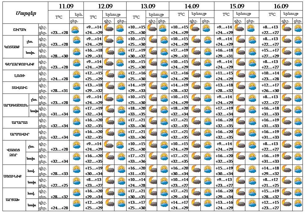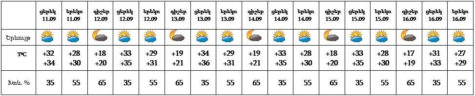 Օդի ջերմաստիճանը սեպտեմբերի 11-ի ցերեկը, 12-13-ը աստիճանաբար կբարձրանա 2-3 աստիճանով, այնուհետև` նույնքան կնվազի: