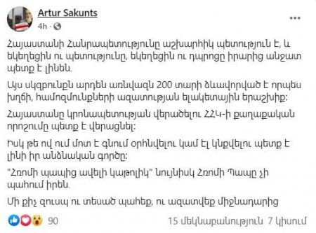 Հոս նախկին իրավապաշտպան պարոն Սաքունցը հայտնում է մեզ, որ «եկեղեցու ու պետության անջատ լինելը խղճի ու համոզմունքների ազատության երաշխիք է»։