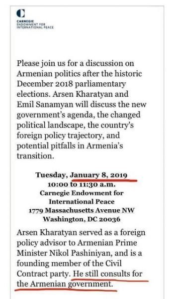 168.am–ի աղբյուրների տեղեկացմամբ, սակայն, Արսեն Խառատյանը Վաշինգտոնում Ադրբեջանի դեսպանի հետ է կապի մեջ եղել, որպեսզի ոչ ֆորմալ հանդիպում ունենա ադրբեջանցիների հետ: Ըստ նույն աղբյուրի՝ իրենք վաղուց ծանոթ են եղել: 2019թ. հունվարին Արսեն Խառատյանը զբաղեցրած պաշտոնից դուրս գալուց հետո շարունակել է պաշտոնապես հանդես գալ՝ որպես ՀՀ կառավարության կոնսուլտանտ, ու այդ պաշտոնով ելույթ է ունեցել Վաշինգտոնի «Քարնեգի» կենտրոնում` ՀՀ դեսպանի ներկայությամբ: