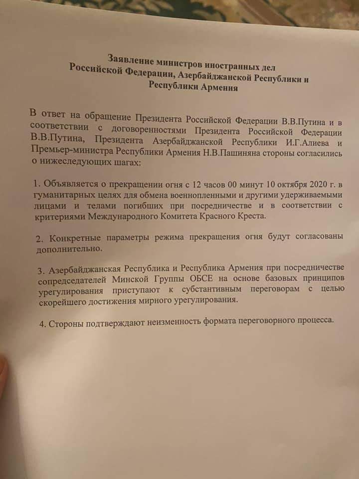 Ի պատասխան Ռուսաստանի Դաշնության նախագահ Վլադիմիր Պուտինի ուղերձի և ՌԴ նախագահի, Հայաստանի վարչապետ Նիկոլ Փաշինյանի ու Ադրբեջանի նախագահ Իլհամ Ալիևի պայմանավորվածության համաձայն՝ կողմերը համաձայնել են հետևյալ քայլերին.