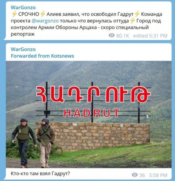 «Քաղաքը գտնվում է Արցախի Պաշտպանության բանակի հսկողության տակ: Շուտով կլինի հատուկ ռեպորտաժ»,-ասվում է War Gonzo-ի Telegram-ի ալիքում: