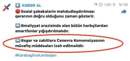 Հայ գերի զինվորների հանդեպ անմարդկային վերաբերմունքը պատկերող վերջին կադրերը տարածելուց մոտ մեկ ժամ անց ադրբեջանական բոլոր լրատվամիջոցներին, սոցիալական ցանցերին ու թելեգրամ ալիքներին հրաման է իջել արագորեն հեռացնել տեսանյութը իրենց ռեսուրսներից։ Ավելին, Ադրբեջանի ՊՆ-ն րոպեներ առաջ հայտարարությամբ փորձեց հերքել այդ տեսանյութի իսկությունը։