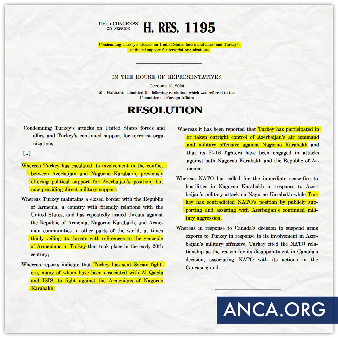 Ինչպես տեղեկանում ենք Ամերիկայի հայկական ազգային համագումարի ֆեյսբուքյան էջից, Գաբբարդի ներկայացրած բանաձևում հստակ արձանագրված է հայկական ուժերի վրա Թուրքիայի ձեռնարկած հարձակումների և մինչ այժմ Անկարայի՝ ահաբեկիչներին աջակցելու փաստերը: