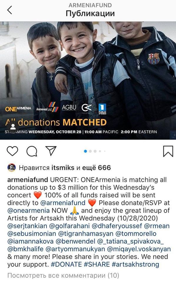Համահայկական հիմնադրամի Ինստագրամի պաշտոնական էջում կոչ են արել նվիրատվություններ անել համերգի օրը Արցախի և Հայաստանի համար: