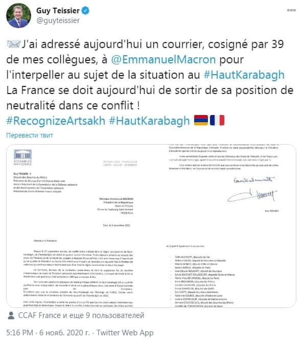 Ֆրանսիայի խորհրդարանի 40 պատգամավոր նամակով դիմել է երկրի նախագահ Էմանուել Մակրոնին՝ կոչ անելով ղարաբաղյան հակամարտությունում հրաժարվել չեզոքության դիրքորոշումից։ Այս մասին Twitter-ի իր միկրոբլոգում գրառում է արել Ֆրանսիայի Ազգային ժողովի պատգամավոր, «Ֆրանսիա-Արցախ» բարեկամական խմբի նախագահ Գի Տեսիեն՝ հրապարակելով նախագահ Մակրոնին ուղղված իր նամակի տեքստը, որը ստորագրել է եւս 39 խորհրդարանական։ Փոխանգում է NEWS.am-ը: