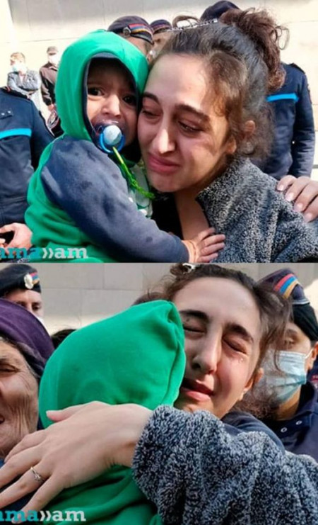 Քրիստինեի ամուսինը զոհվել է Արցախում պատերազմի ժամանակ։ Այսօր հղի կինն իր երեխայի, մոր հետ եկել է Ազատության հրապարակ՝ բարձրաձայնելու, որ դեմ է իր տունը, հայրենիքը հանձնելուն։