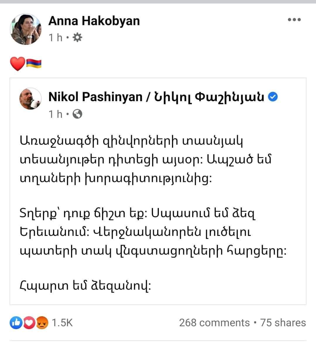 Նիկոլ Փաշինյանի գրառմանբ կիսվել էր նաև Աննա Հակոբյանը: