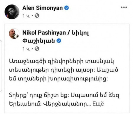 Նիկոլ Փաշինյանի աղմկահարույց գրառմամբ կիսվել է Ալեն Սիմոնյանը, որոշ ժամանակ անց ջնջել այն