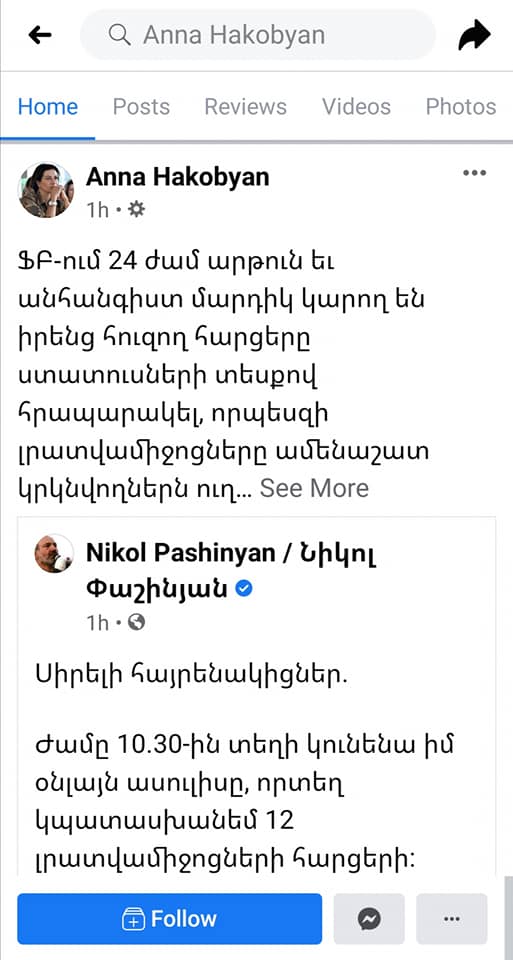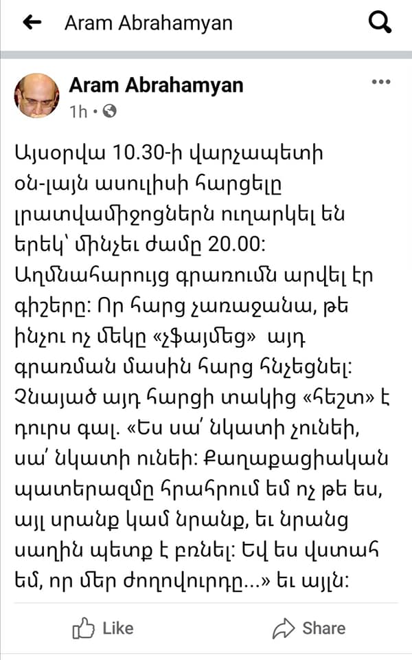 «Իսկ հիմա, ընկերներ, տեսեք, թե ինչպես աշխատում նիկոլենց՝ ստի և խաբեբայության ընտանեկան բիզնեսը. իրականում այս ասուլիսի հարցերը դեռ երեկ երեկոյան են ուղարկվել: