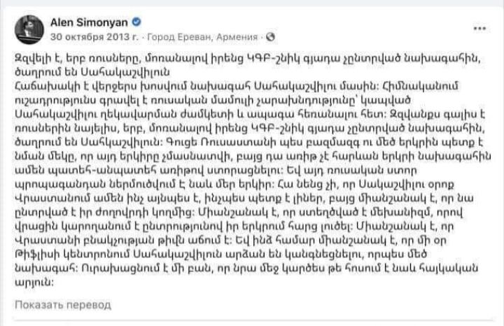 Օրինակ հարց է առաջանում, թե ինչպես ռուսները կարող են վստահել ԱԺ փոխխոսնակ Ալեն Սիմոնյանին, մարդու ով հանուն Վրաստանի նախագահ հակահայ Սահակաշվիլիի, ՌԴ նախագահին պիտակավորող տեքստերով էր հանդես գալիս։ 2013-ին, օրինակ, Ալեն Սիմոնյանը համարում էր, որ Վլադիմիր Պուտինը «ԿԳԲ-շնիկ գյադա» և «չընտրված նախագահ» է։