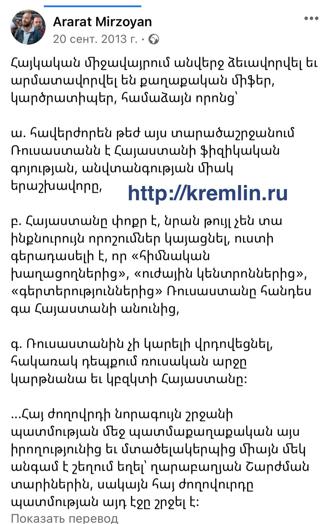 Օրինակ՝ հակառուսական ցույցերին մասնակցելու սիրահար Արարատ Միրզոյանը նախկինում առասպել էր անվանել այն փաստը, որ «Ռուսաստանը տարածաշրջանում Հայաստանի անվտանգության միակ երաշխավորն է»: