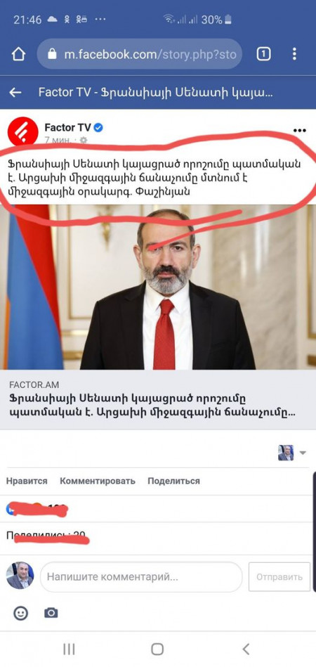 Մի քանի օր առաջ Նիկոլը թուրքին հանձնեց մեր Հայրենիքի մի մասը, իսկ հիմա Ֆրանսիայի Սենատի կողմից իրավական ոչ մի հետևանք չունեցող բանաձևից է հրճվում...