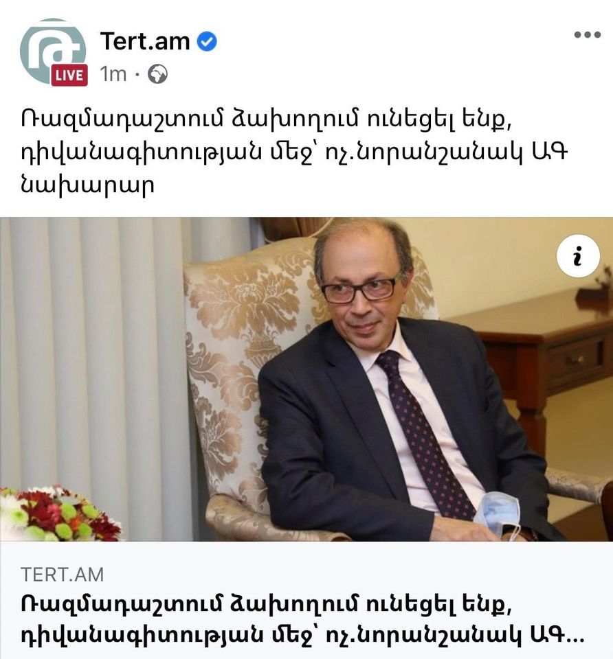 Կողմ դնենք, որ առնվազն տգեղ է ու ոչ կոլեգիալ իրեն նախարար համարող մարդու համար եկած-չեկած ամեն բան բանակի «գրպանը» գցելը։ Ես իրեն չեմ ճանաչում անձամբ, բայց ճանաչողներին խնդրում եմ դավաճանից պաշտոն վերցրած ու դրանից զարմացած էս ապուշին բացատրեք, որ եղած լայնամասշտաբ պատերազմի սկսվելը դիվանագիտության ոչ թե ձախողում է, այլ ամբողջական տապալում, ու միայն ես ժամերով կարող եմ պատմել, թե երբ, որտեղ ու ինչպես։ Ու հերիք եղավ վիրավորեք մտածող մարդկանց ինտելեկտը, արդեն սպառել եք ձեր նկատմամբ քաղաքակիրթ վարվեցողության ողջ պաշարը։