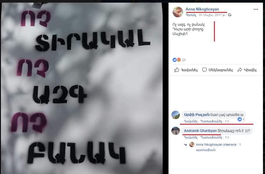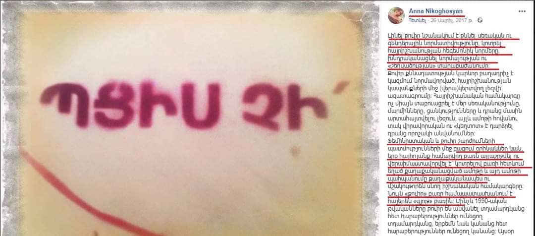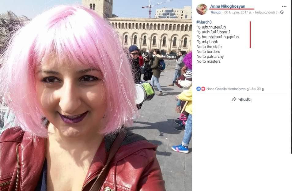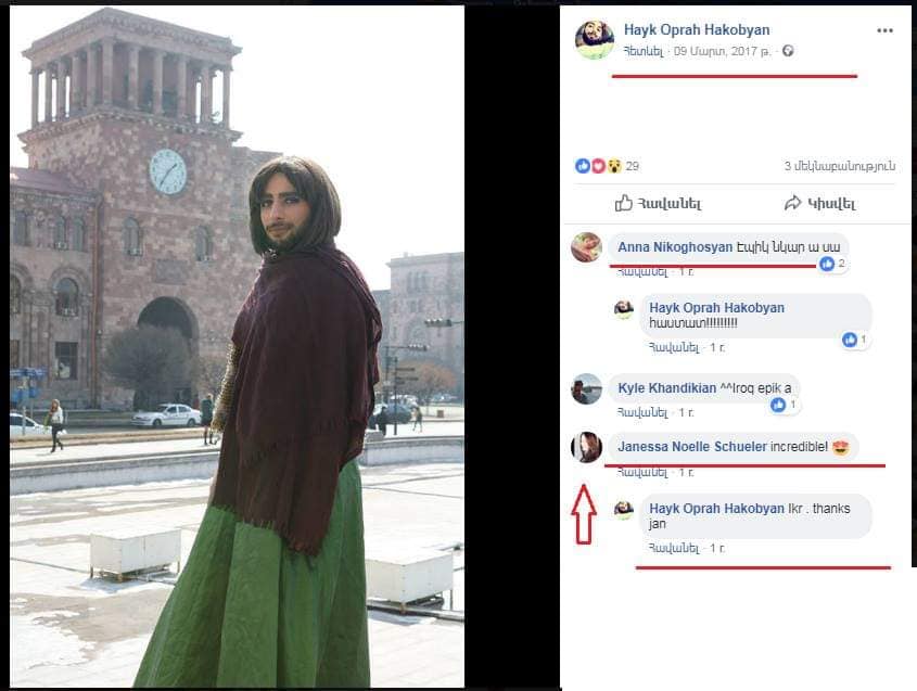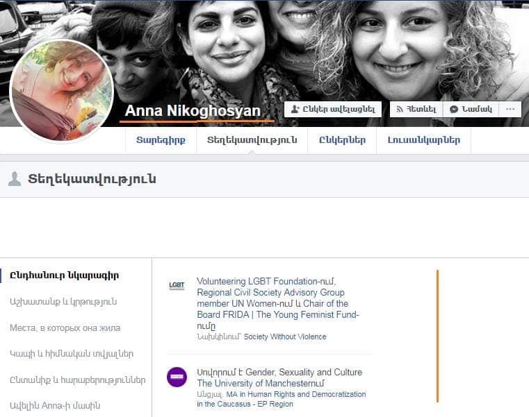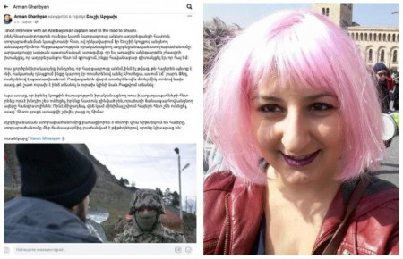 «Համացանցում տարածվում է մի նյութ, որում ոմն Արման Ղարիբյան գրում է, թե Շուշիում հարցազրույց է վերցրել ադրբեջանցի հատուկ ստորաբաժանման կապիտանից՝ նրան ներկայացնելով շատ «պուպուշ գույներով»: Մինչ հանրությունն արդարացիորեն քննադատում է ակնհայտ քարոզչություն պարունակող այդ նյութը, անտեղյակներին հուշեմ, որ այդ Արմանը՝ հայտնի լգբտ ակտիվիստ, հակաբանակային ու հակաեկեղեցական բազմաթիվ ցույցերի առանցքային դերակատար, Ստամբուլում վերապատրաստումներ անցած Աննա Նիկողոսյանի «ամուսինն է»: