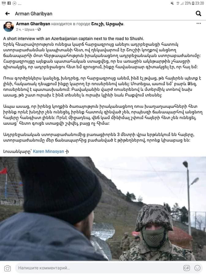 Բայց ինձ այլ հարց է հետաքրքրում։ Նյութի մեջ այդ Արմանը նշում է, թե այնտեղ էր իր «ռուս գործընկերոջ» հետ։ Նախ կցանկանայի պարզել, թե այդ ի՞նչ «ռուս գործընկերներ են», որոնք սրանց ազատ ելումուտի հնարավորություն են տվել։ Հետիշխանափոխական շրջանում ամենալայն արտոնություններ ստացած սորոսական ապազգային, հակահայ խունտան ողջ պատերազմի ընթացքում ակտիվ ելումուտ ուներ Արցախ և նույնիսկ ռազմական նշանակության օբյեկտներ։ Բայց փաստացի ստացվում է, որ հիմա նույնպես այդ խմբակը ակտիվ կերպով շարունակում է իր գործունեությունը։