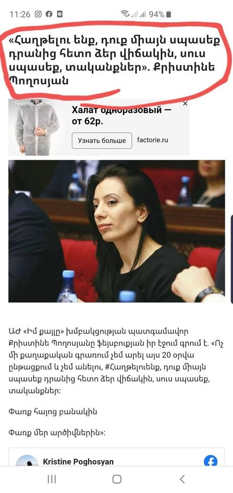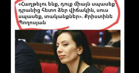 Պատերազմի օրերին ազգադավ և թուրքի դեմ ծնկած Նիկոլի քայլիստկա-երեսփոխանուհիներից մեկն իր facebook-յան էջում իր իսկ ոճին բնորոշ գրառում էր կատարել և սպառնացել՝ "Ոչ մի քաղաքական գրառում չեմ արել այս 20 օրվա ընթացքում և չեմ անելու,դուք միայն սպասեք դրանից հետո ձեր վիճակին, սուս սպասեք տականքներ"...
