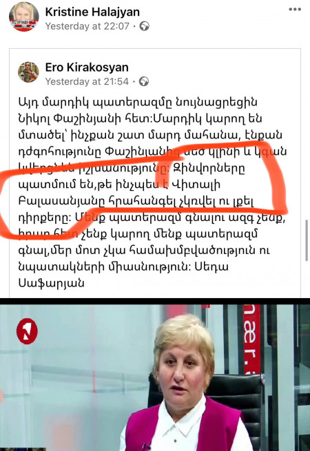 Եթե պարզվի, որ Սաֆարյան Ստոյպիկի քույրը սուտ ա խոսում (ինչում համոզվամ եմ), ապա սա նիկոլի կողմից կազմակերպված դիվերսիա ա ընդդեմ Արցախի: Հետևաբար հողատու վիժվածքին պիտի դատել նաև երկիրը հետպատերազմական ցնցումների տանելու համար: Համոզված եմ՝ տենց էլ լինելու ա»: