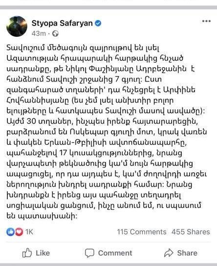 Ես Ազատության հրապարակում այսօր ելույթ չեմ ունեցել։ Հարթակից նման բան չեմ հնչեցրել։ Տավուշի մարզի մասին ԱՌՀԱՍԱՐԱԿ չեմ խոսել։ Որեւէ նման միտք չեմ հնչեցրել։ Սա լկտի սուտ է հանրային խորհրդի նախագահի կատարմամբ։ Հերթականը։ Սա փաշինյանական մակարդակի սուտ է։ Խոսել եմ Սյունիքի մարզի 7 համայնքների ղեկավարների կողմից դավաճանի հրաժարականի պահանջի մասին։