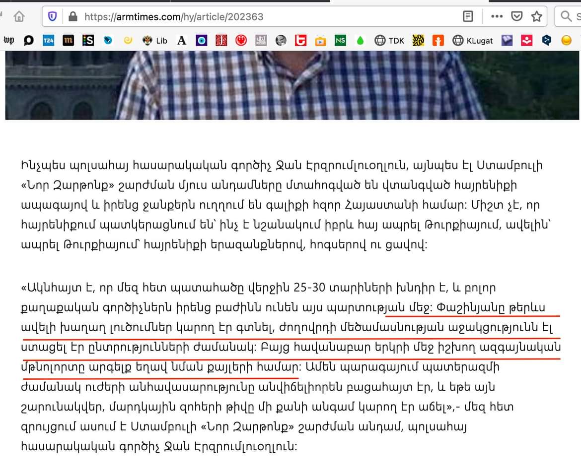 «Հայկական ժամանակ» օրաթերթը երեկ հարցազրույց է հրապարակել պոլսահայ հասարակական գործիչ ոմն Ջան էրզրումօղլուի հետ (հոդվածի հղումը՝ armtimes.com/hy/article/202363)։
