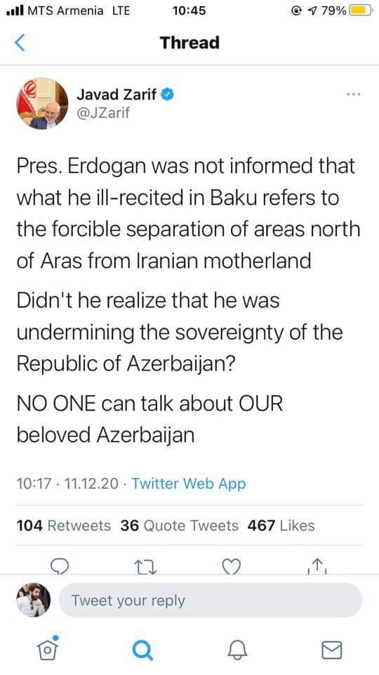 Իրանի ԱԳՆ Ջ. Զարիֆը թվիթերում նուրբ, իրանական ոճով, բայց դիվանագետական ապտակի ձևով անդրադարձել է Էրդողանի` երեկ Բաքվում հնչեցրած մտքերին ու տարածքային նոր հավակնություններին: