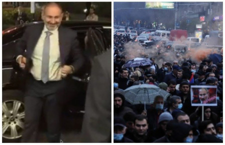 Ռազմական դրության մեջ գտնվող, պետության սահմանները վտանգված երկրի վարչապետ Նիկոլ Փաշինյանը ժամը 18։30-ի սահմաններում շտապել է դուրս գալ կառավարության շենքից՝ չհանդիպելու իր հրաժարականը պահանջող ժողովրդական լայն զանգվածներին։