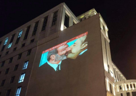 Համացանցում հայտնվել են կադրեր Նիկոլ Փաշինյանի դեմ իրականացված ակցիայից, որի շրջանակում ՀՀ ԱԳՆ-ի շենքին հայտնվել է Նիկոլ Փաշինյանի եւ Իլհամ Ալիեւի ծաղրանկարը։