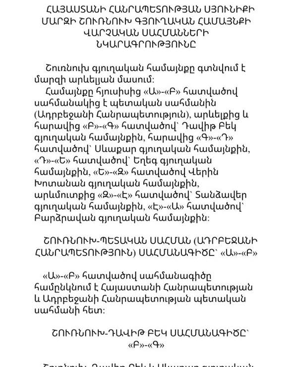 ՀՀ վարչապետ Նիկոլ Փաշինյանը ֆեյսբուքյան իր էջում գրել է. «Սրանք Հայաստանի Հանրապետության վարչատարածքային բաժանման մասին օրենքի հավելվածներում Սյունիքի մարզի Շուռնուխ և Որոտան գյուղերի սահմանագծերի նկարագրություններն են։