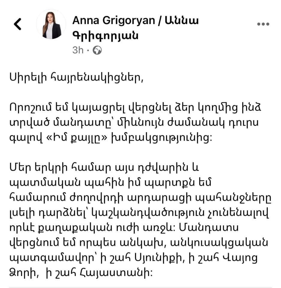 ԱԺ-ում մի իմքայլականի հրաժարականի հետևանքով առաջացել է թափուր մանդատ, որն ըստ կարգի՝ պետք է փոխանցվի 2018-ի ընտրություններում հաջորդ առավել շատ ձայներ ստացած անձին։ Այդ անձը Աննա Գրիգորյանն է, քաղաք Կապան, որը հրապարակավ հայտարարում է, որ (ա) մանդատը վերցնելու է, և (բ) դուրս է գալու «Իմ քայլը» ֆրակցիայից։