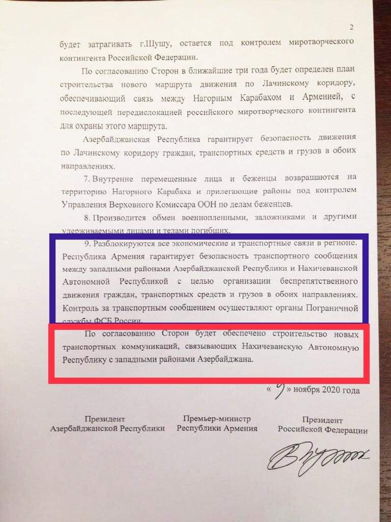 Իսկ ահա կարմիրով՝ ամենավտանգավոր պարտավորությունը, այն է՝ Ադրբեջանը Նախիջեւանին կապող ՆՈՐ, այսինքն հատուկ տրանսպորտային կոմունիկացիա։