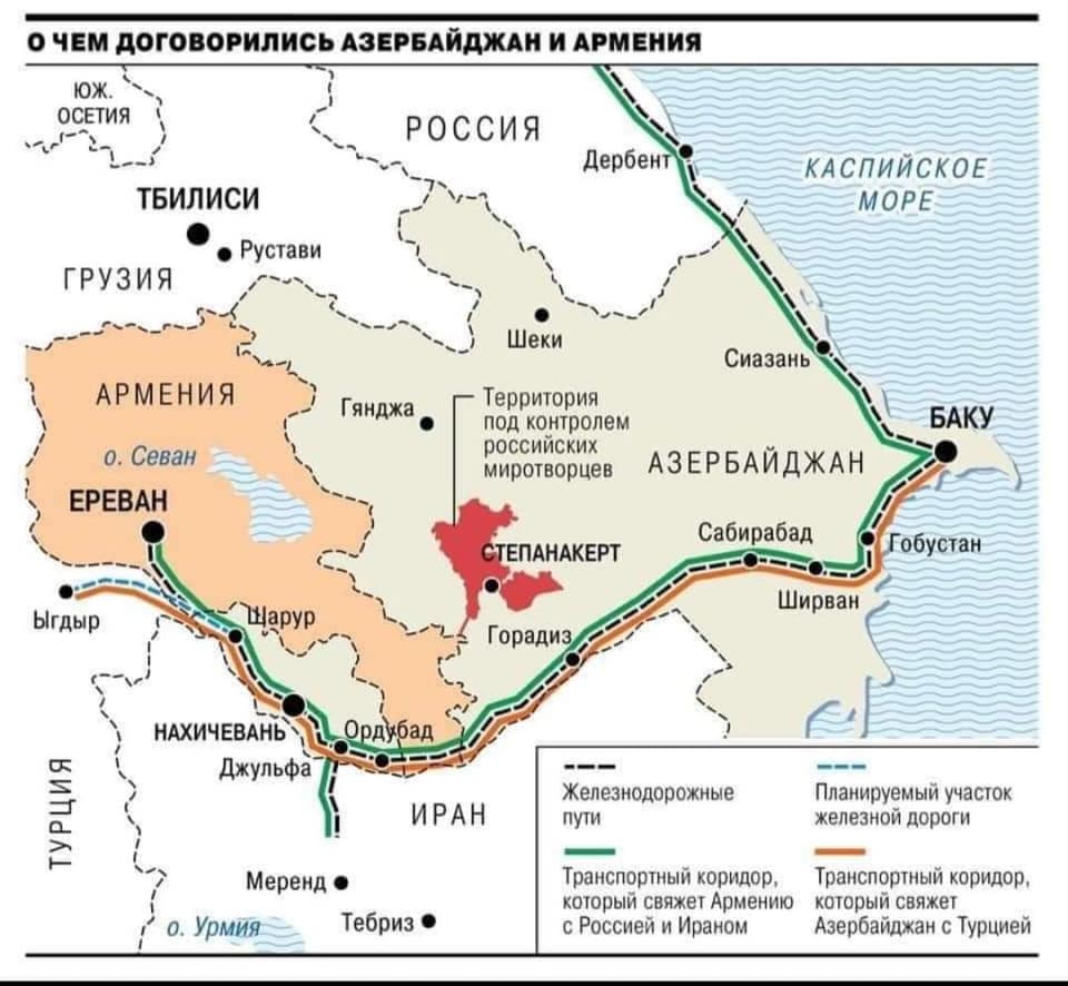 Ռուսական «Կոմերսանտ» լրատվական կայքէջը հրապարակել է տրանսպորտային միջանցքների, ներառյալ՝ երկաթուղու քարտեզը, որի շուրջ համաձայնության են եկել Հայաստանն ու Ադրբեջանը։
