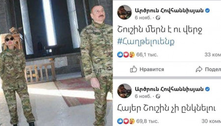 ԲՀԿ-ական պատգամավոր Նաիրա Զոհրաբյանը ֆեյսբուքյան իր էջում գրել է. «Էսօր Ալիևը կնոջ հետ Շուշիում է։ Չգիտեմ՝ Մեհրիբանը Շուշիում չայ խմեց, թե չէ, բայց նոյեմբերի 6-ին, երբ Շուշին արդեն հանձնված էր թուրքին, էս մարդն ահա էսպիսի գրառում էր անում։