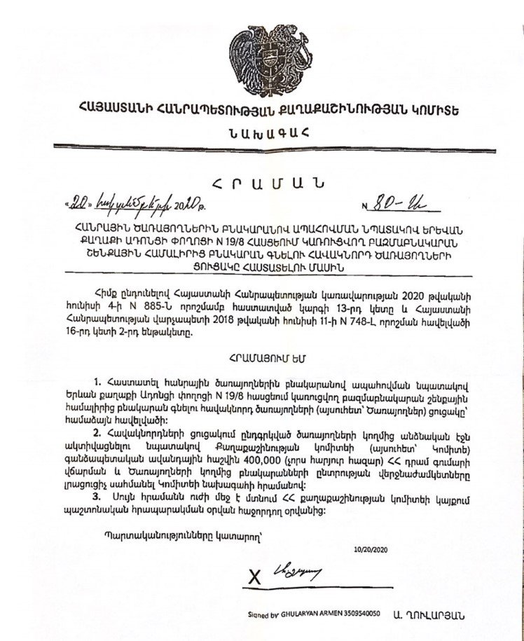 ՀՀ քաղաքաշինության կոմիտեի նախագահ Արմեն Ղուլարյանը արցախյան պատերազմի թեժ օրերին՝ 2020թ․ հոկտեմբերի 20-ին, հաստատել է հանրային մի շարք ծառայողների Երևանի Ադոնցի փողոցի N 19/8 հասցեում կառուցվող բազմաբնակարան շենքային համալիրից բնակարան գնելու հավակնորդ ծառայողների ցուցակը։ Որպես բնակարանային առաջնահերթ կարիք ունեցող՝ ցուցակում նշված է Դատական դեպարտամենտի աշխատակից Լիանա Նորայրի Ղազարյանի անունը։ Լիանա Նորայրի Ղազարյանը ՀՀ գլխավոր դատախազի տեղակալ Գևորգ Բաղդասարյանի կինն է։
